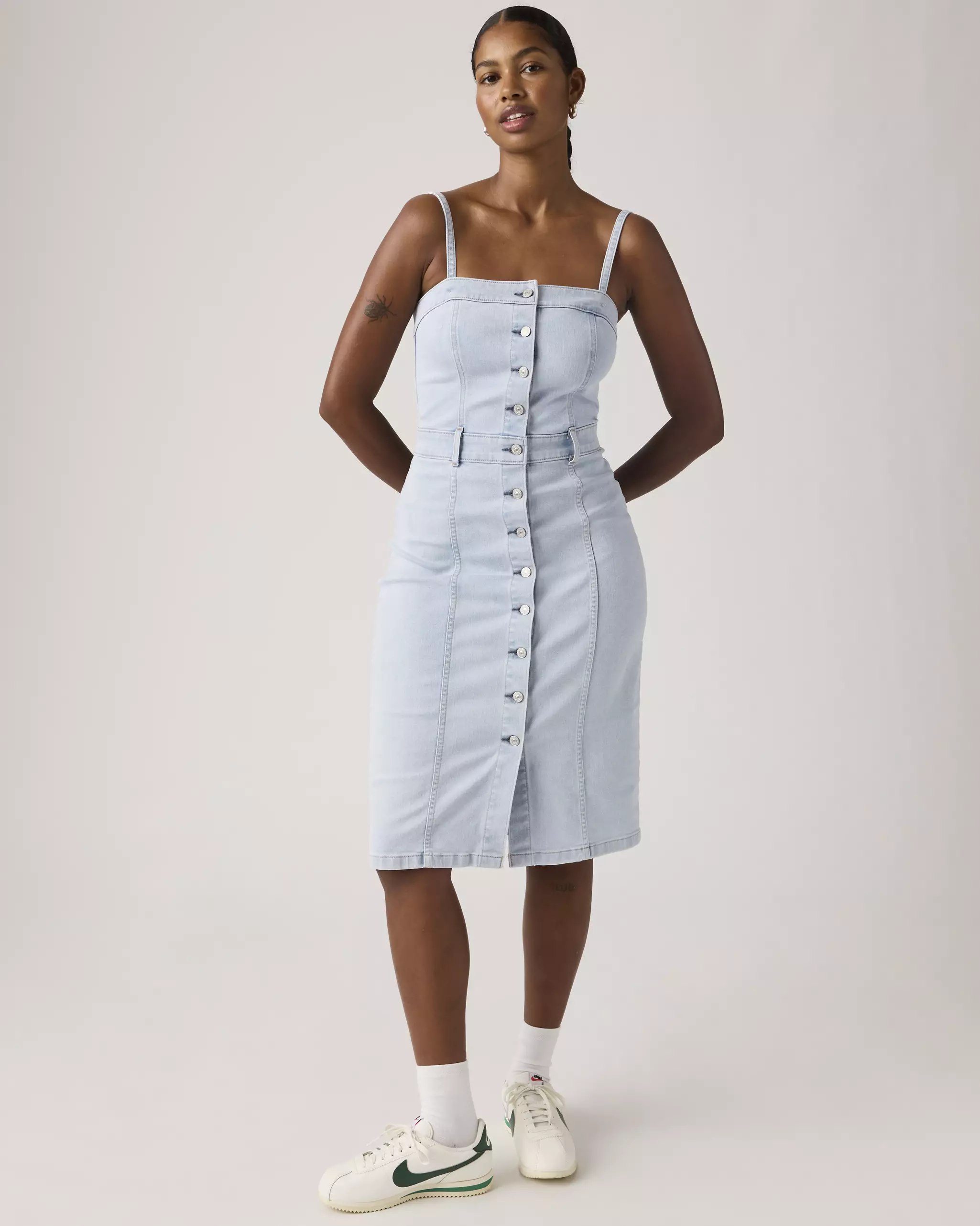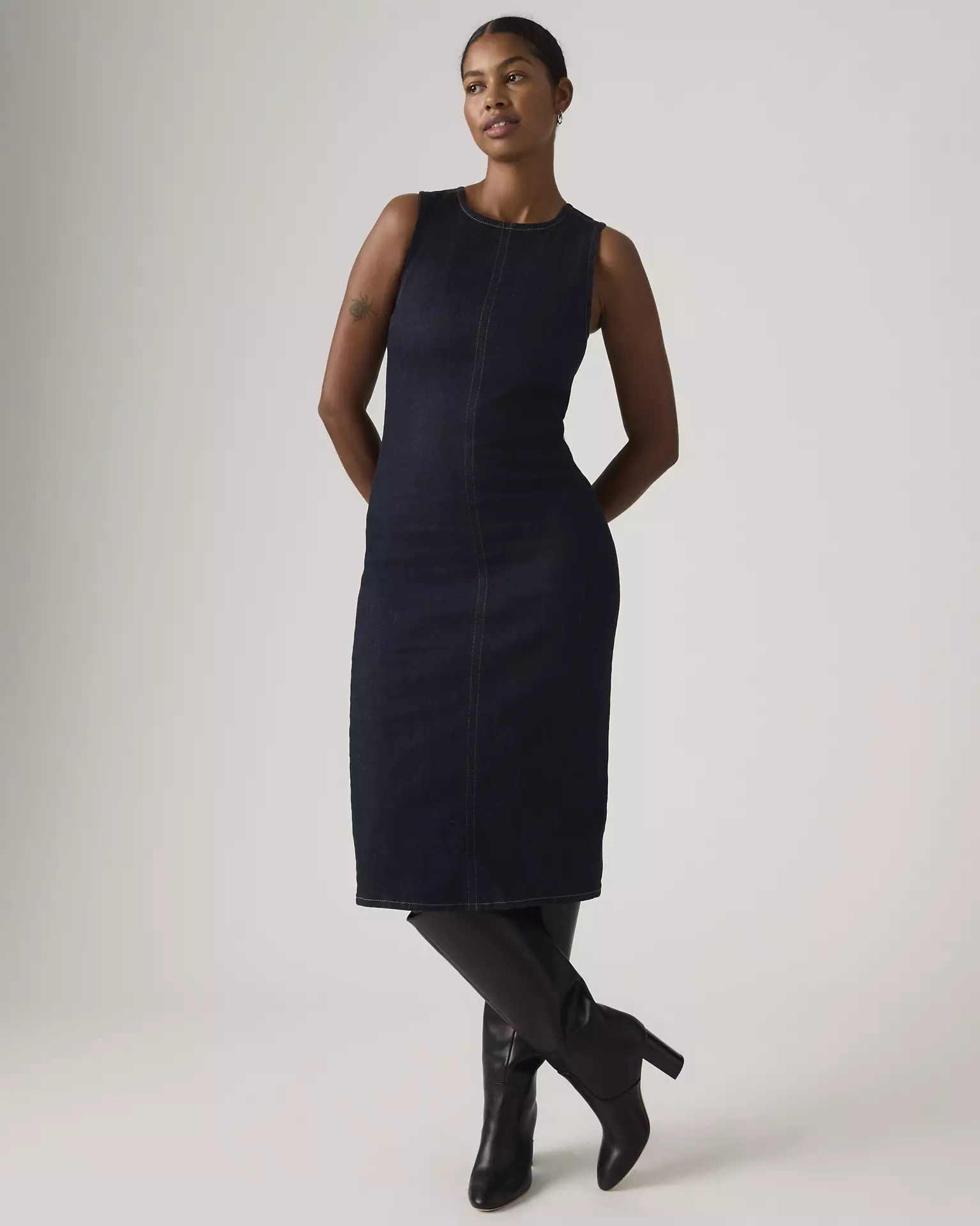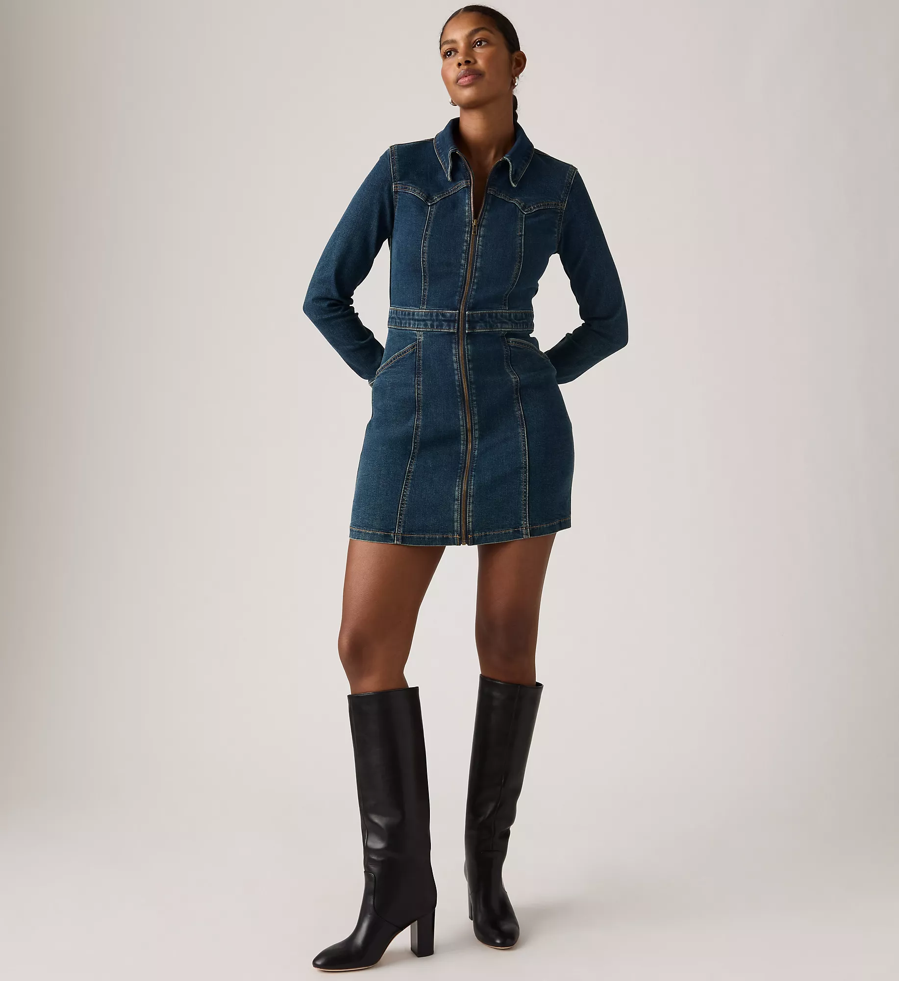 Styles include: 90s Denim Slip Dress, 90s Column Dress, Godet Denim Dress, 90s Shift Dress, Jadine Dress, Seamed Bustier Dress, Iconic Sleeveless Dress, Vianna Dress, LS Retro Zip Dress, Logan Dress, Denim Tee Dress, & Bustier Dress.