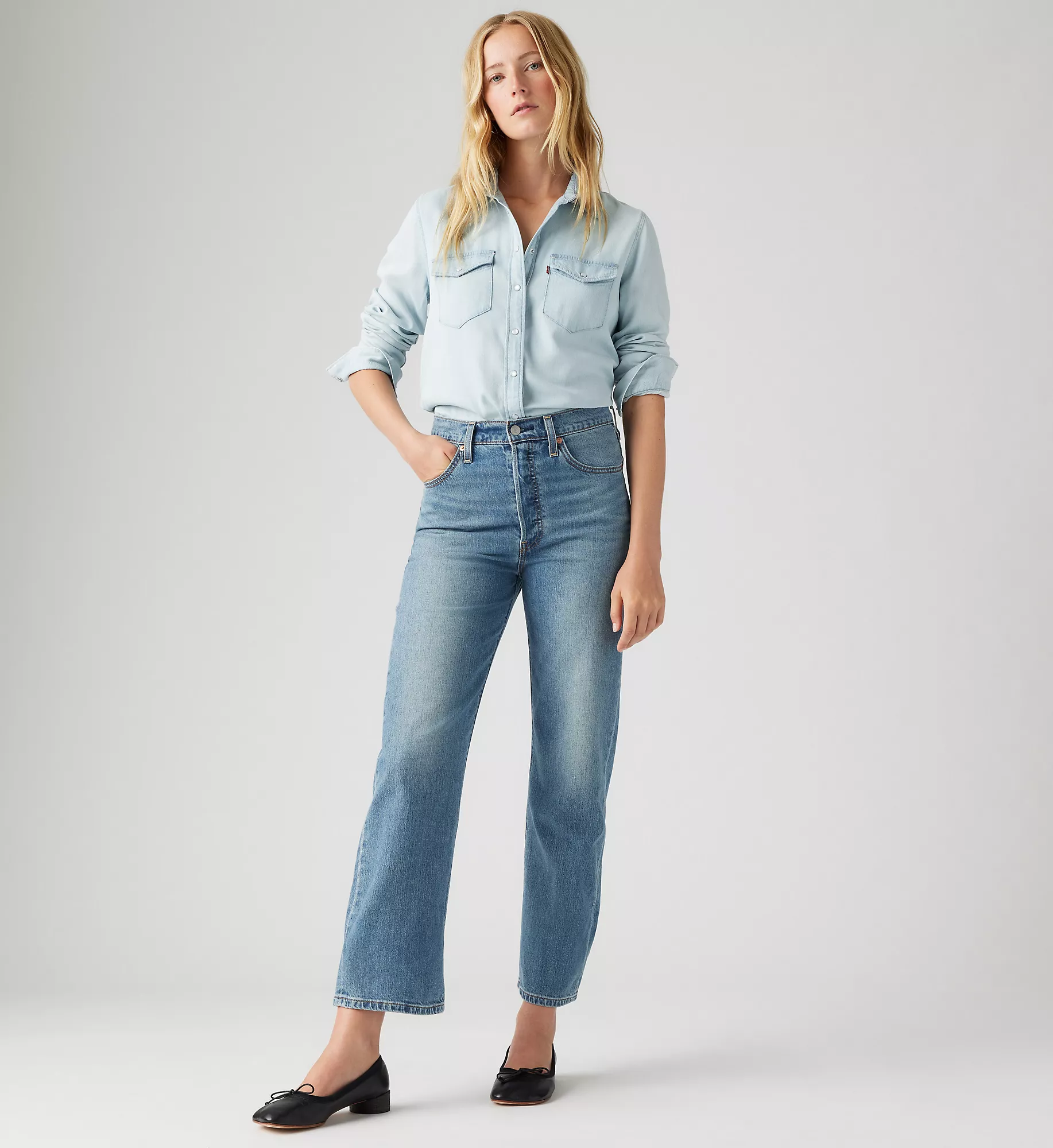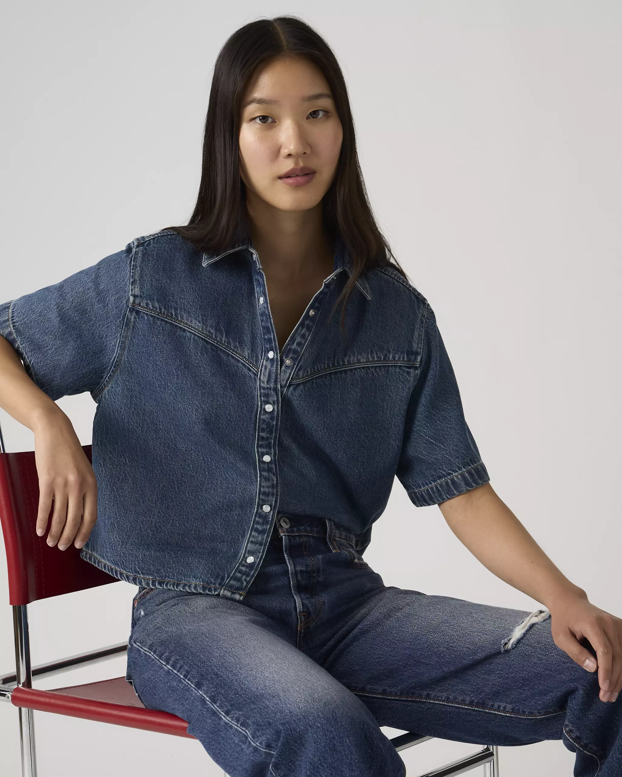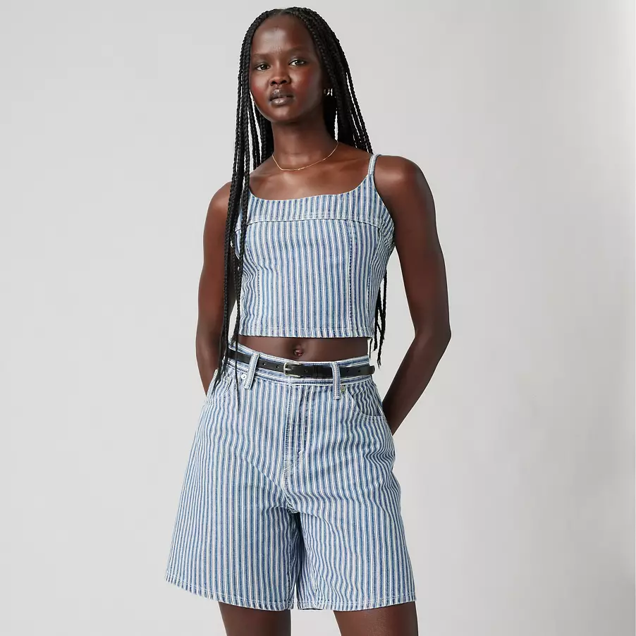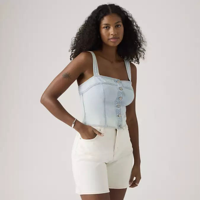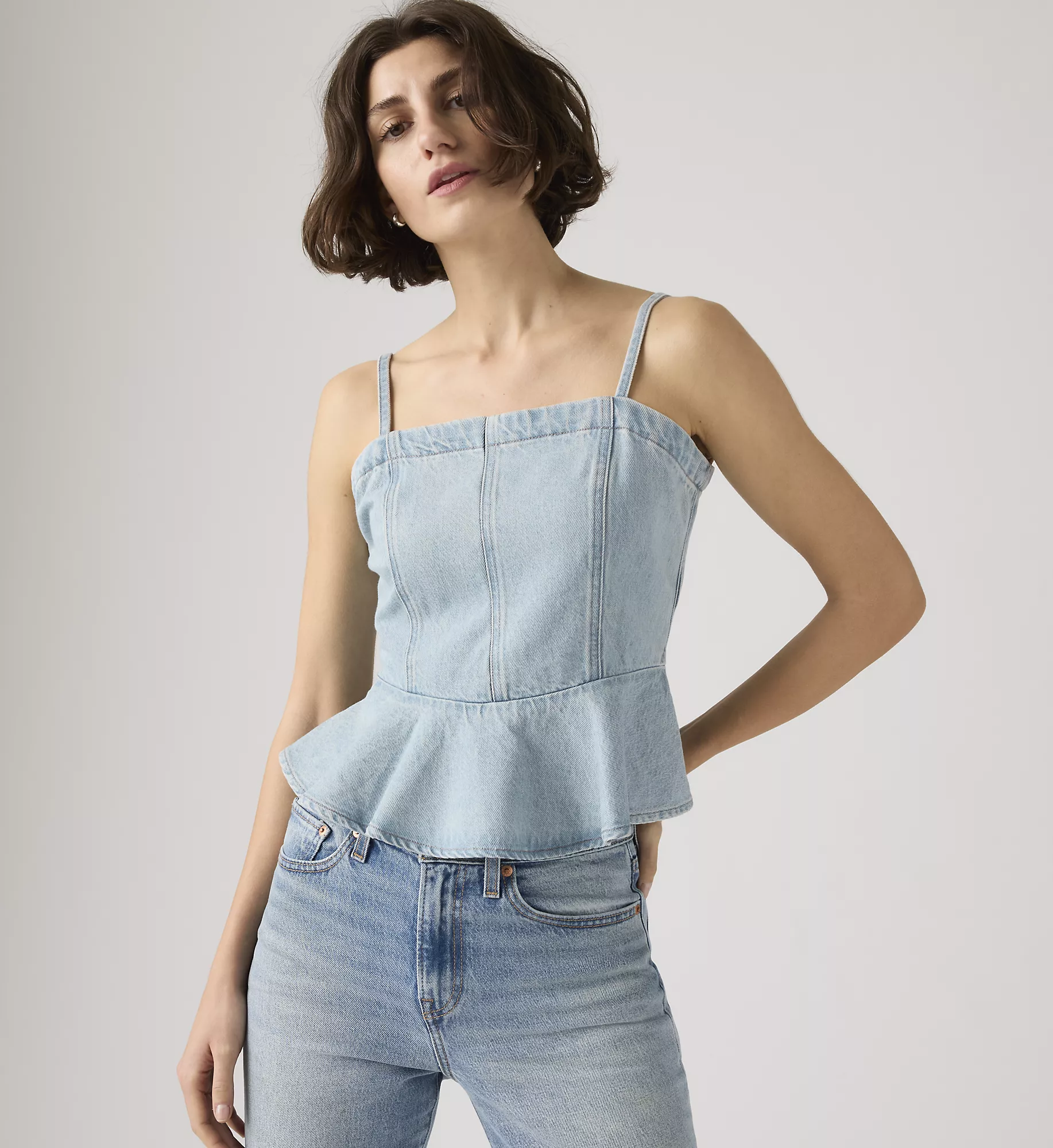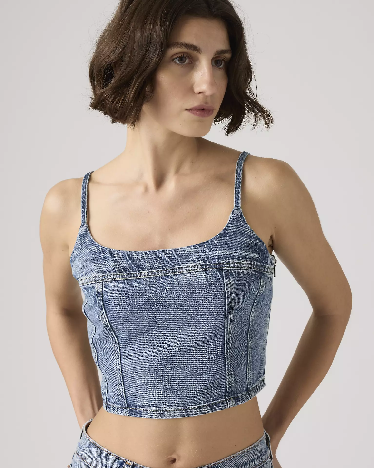 Strappy denim top with iconic trucker seaming details for versatile head-to-toe styling.