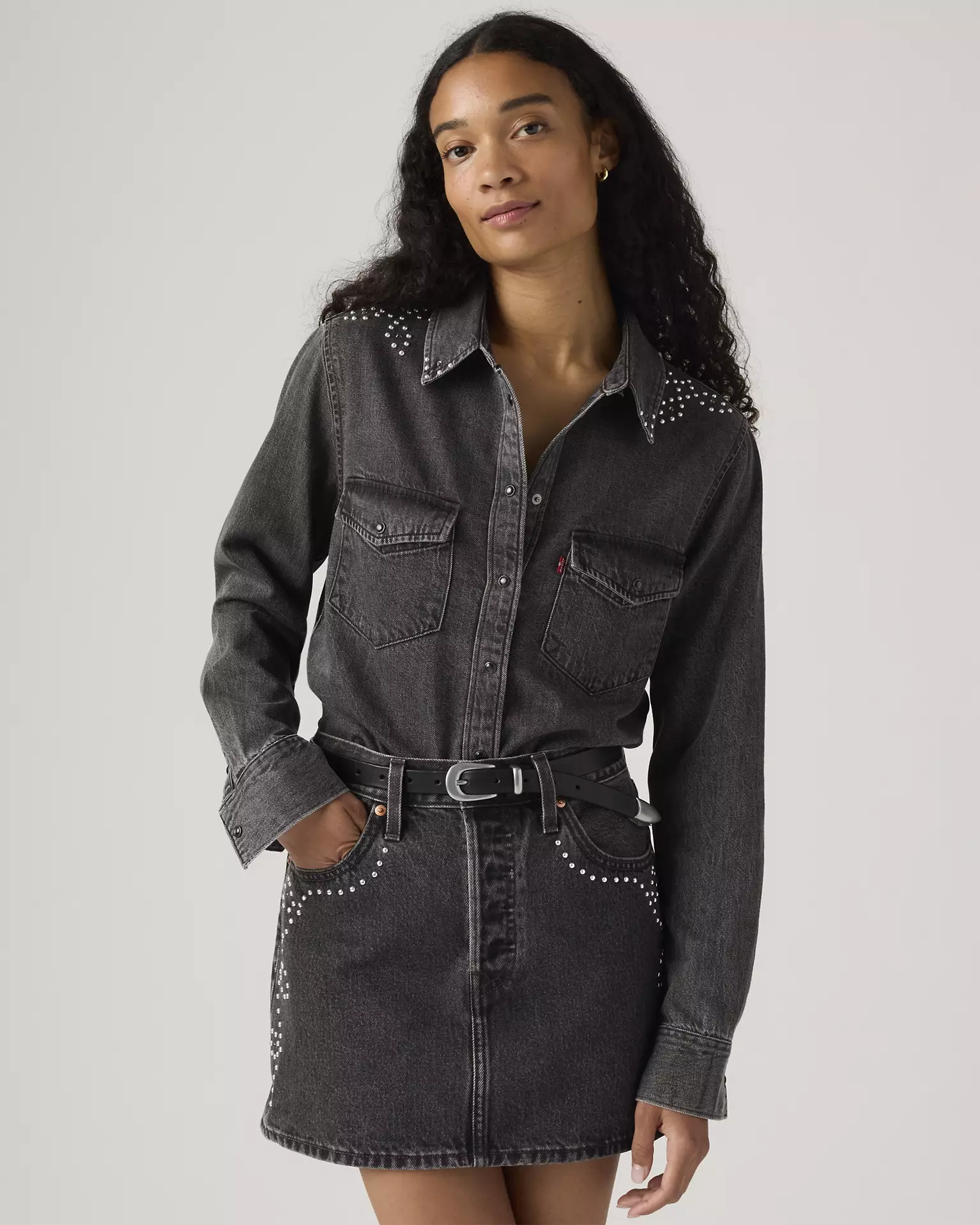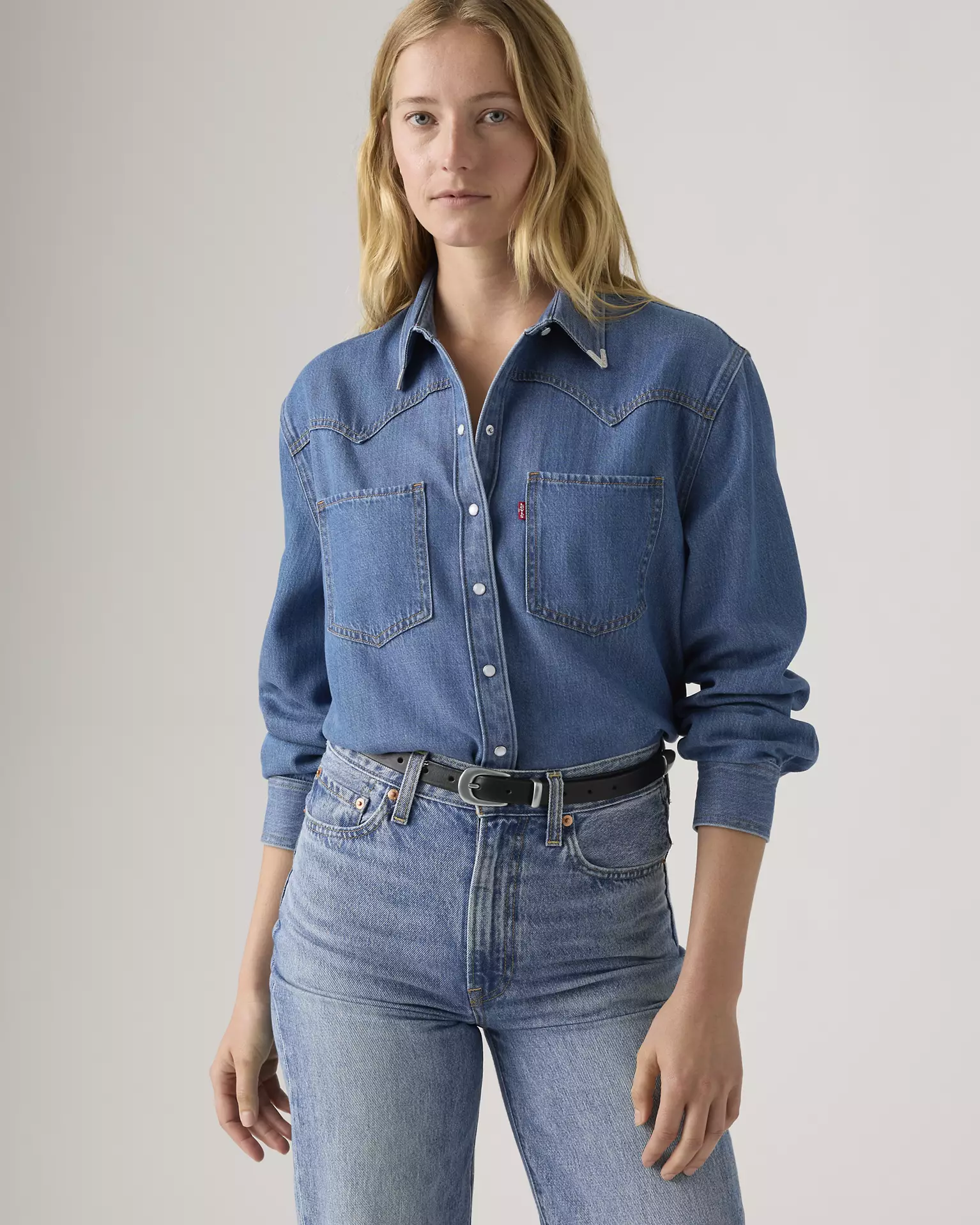 Refined Western-style denim shirt featuring polished tips. Minimal text, large imagery.